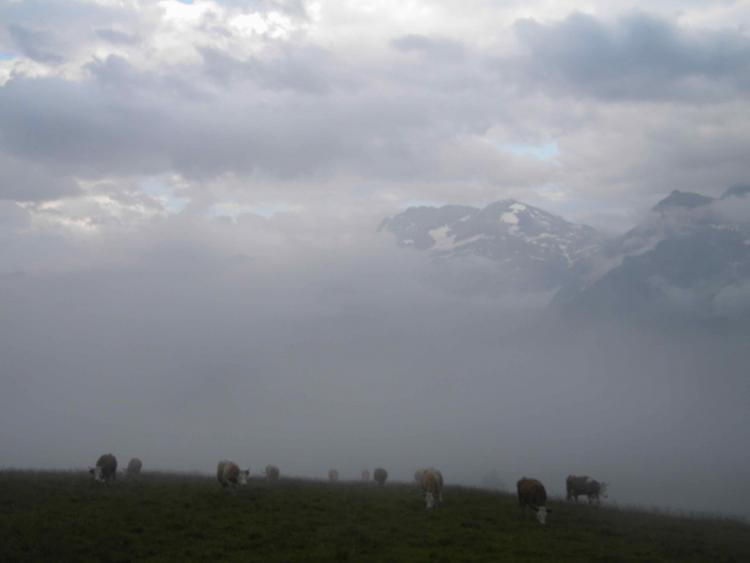 Die Kühe müssen jetzt nachts weit laufen, um genügend Gras fressen zu können. Morgens ist es dann für uns nicht immer so einfach, sie zu finden und davon zu überzeugen, dass sie doch bitte mit uns zum melken kommen sollen. Oft trifft man die Nachbarn, wenn man über den Grat turnt und jeder seine Kühe sucht. Spannend wird das Ganze bei Nebel. Wenn man morgens rausgeht, ganze 5 Meter weit sieht und weit und breit keine Glocke hört. Dann sind die 280 Hektar Weidefläche ein grosses Gebiet.